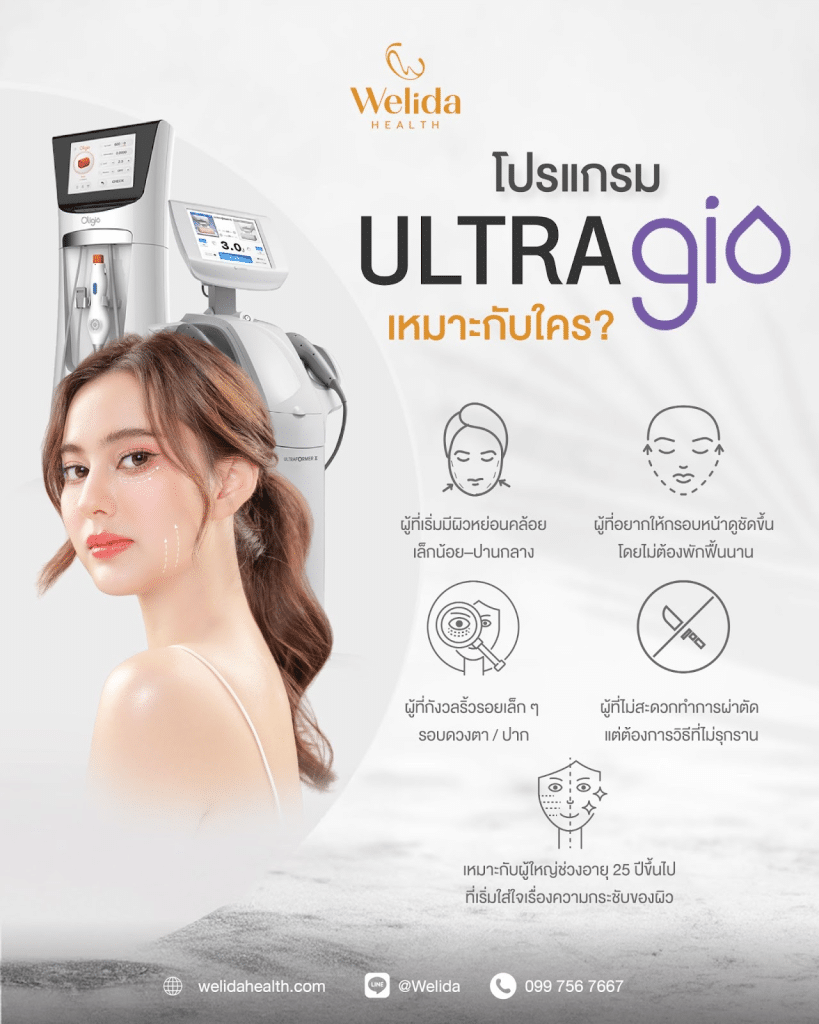 UltraGio (อัลตราจิโอ) คือโปรแกรมนวัตกรรมที่ผสมผสานเทคโนโลยี ULTRAFORMER (HIFU) เข้ากับ Oligio (Monopolar RF) เพื่อแก้ปัญหาผิวหน้าให้แตกต่างจากเดิมและครอบคลุมทั้งการ ยกกระชับชั้นลึก และ ลดไขมันส่วนเกิน โดยการทำหัตถการนี้ไม่ต้องผ่าตัดหรือพักฟื้น นวัตกรรมนี้เหมาะกับคนที่ต้องการผลลัพธ์เห็นถึงการเปลี่ยนแปลงที่ชัดเจน แต่ก็ยังดูเป็นธรรมชาติอยู่